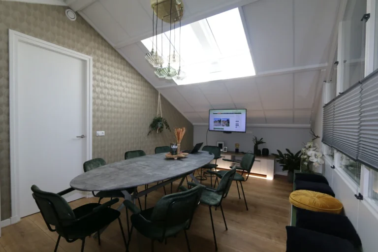 Vergaderruimte boven voor 8 personen aan een vergadertafel en een extra 4-6 personen op de bank.